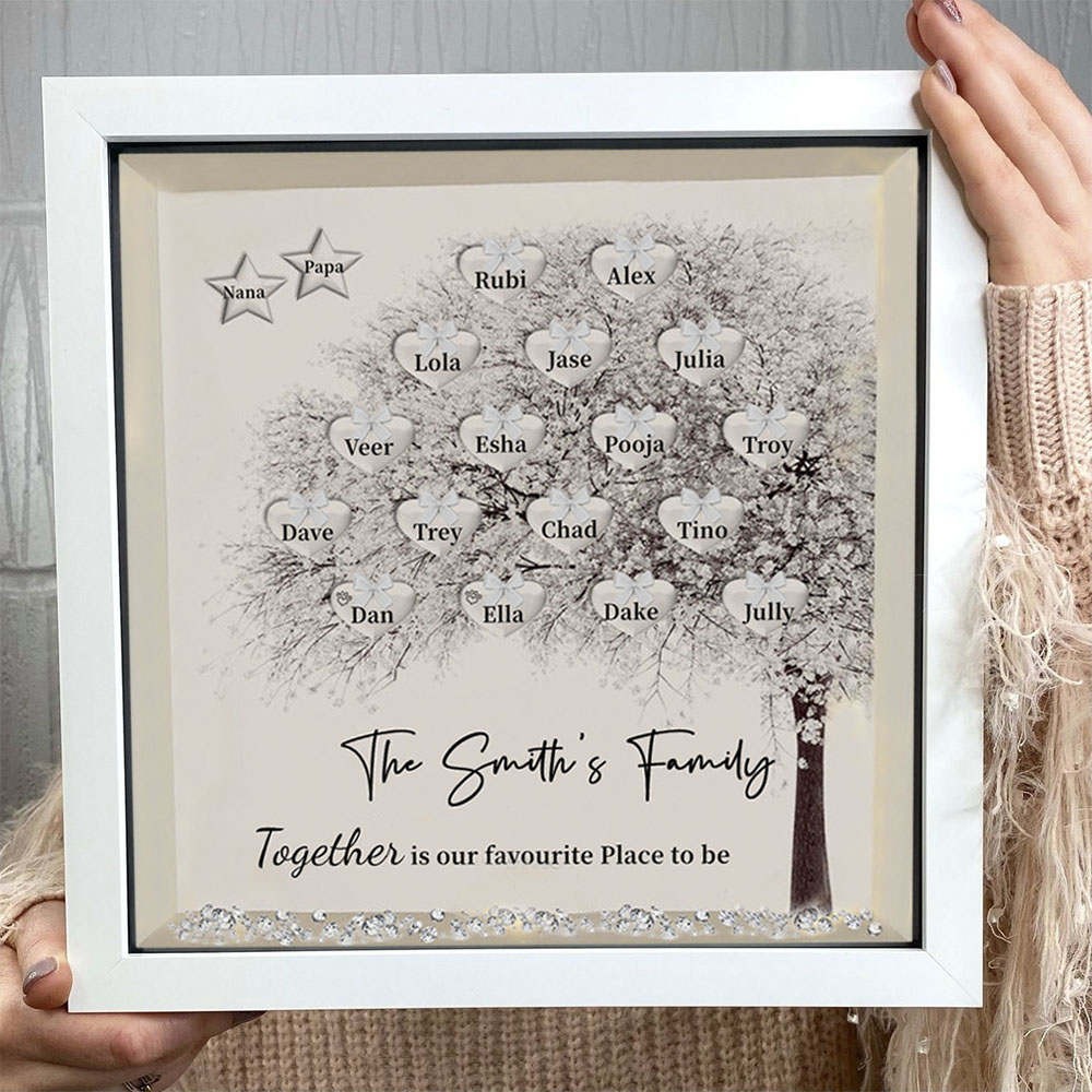 This wonderful framed family tree that is printed and engraved with custom family names makes a great gift or a perfect addition to any room.