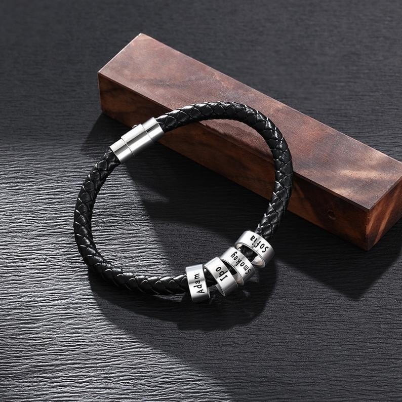 Personalisiertes Lederarmband mit schwarzer Gravur und 1-10 Perlen
