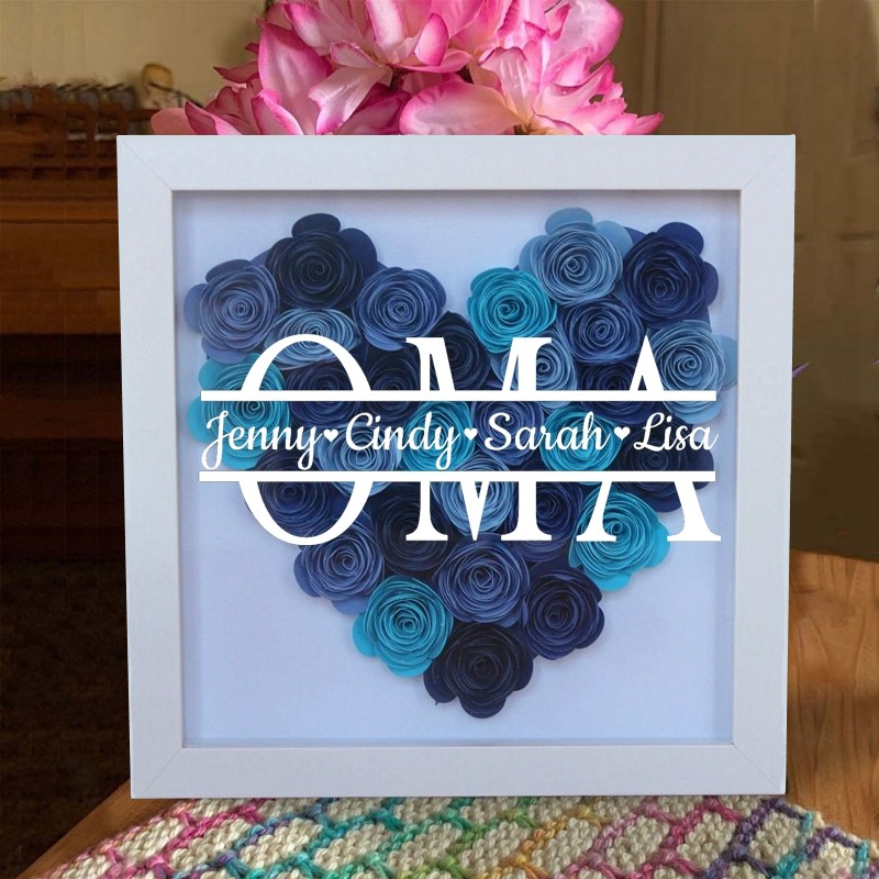 Personalisierte herzförmige Blumen-Schattenbox mit Kindernamen für Oma