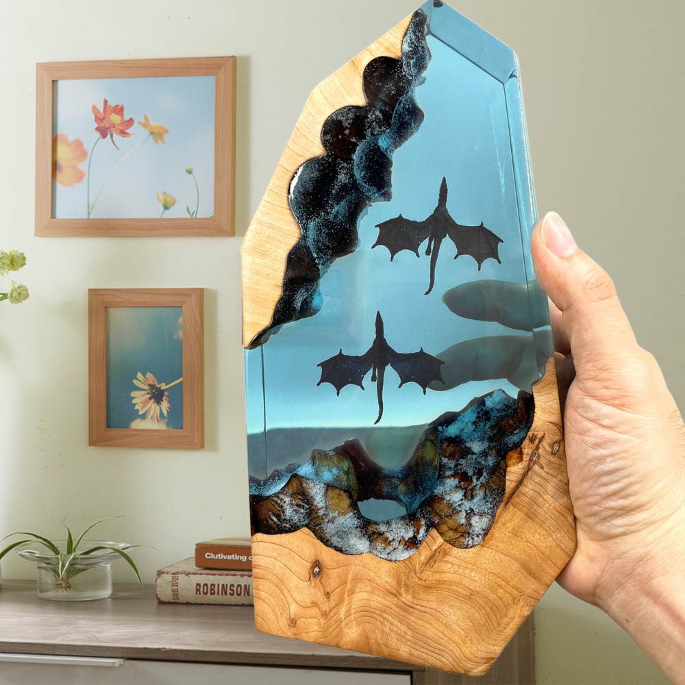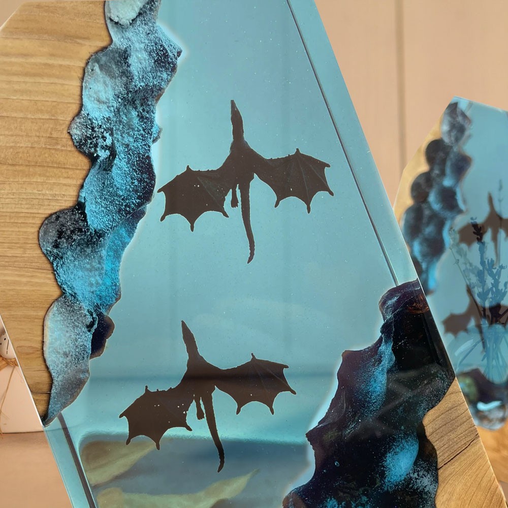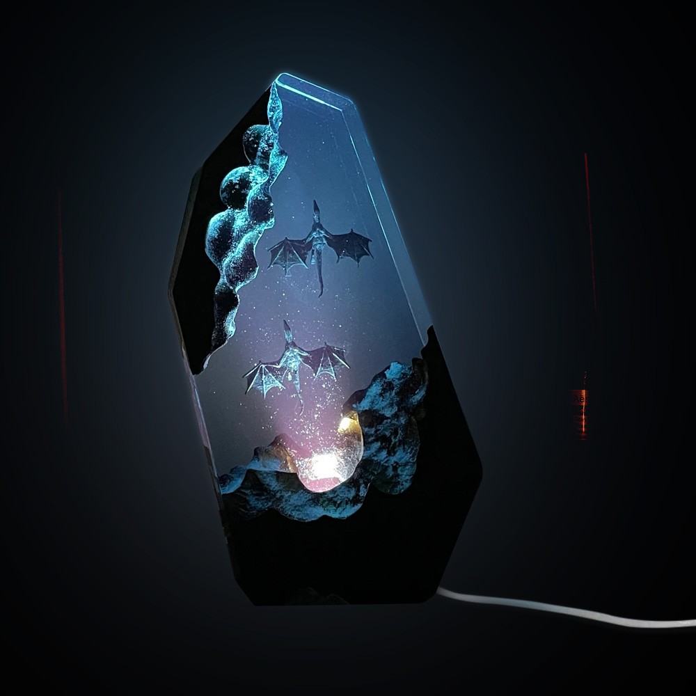 Das Kunst-Nachtlicht aus Kunstharz und Holz, dessen Licht von unten eindringt, beleuchtet die Mantarochen und die Taucher in der Höhle. Schalten Sie nachts das Licht ein, voller dieser geheimnisvollen Farbe. Die Beleuchtung besteht aus monochromatischen LEDs und wird über Tasten gesteuert.