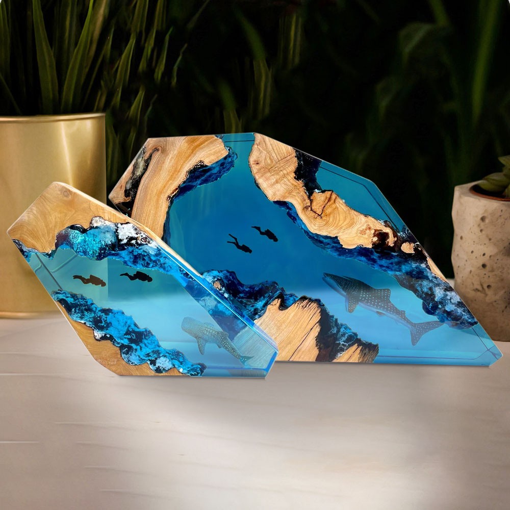 Das Kunst-Nachtlicht aus Kunstharz und Holz, dessen Licht von unten eindringt, beleuchtet die Mantarochen und die Taucher in der Höhle. Schalten Sie nachts das Licht ein, voller dieser geheimnisvollen Farbe. Die Beleuchtung besteht aus monochromatischen LEDs und wird über Tasten gesteuert.