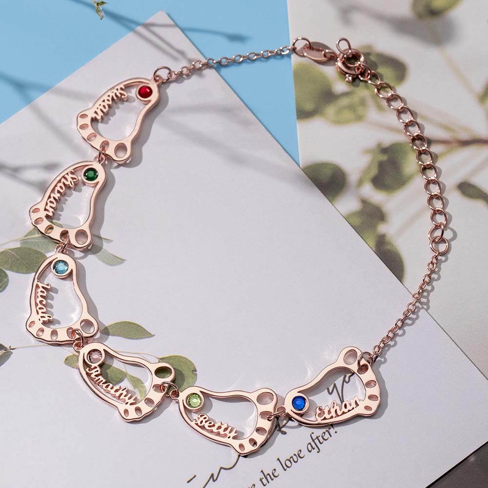 Silbernes benutzerdefiniertes 1-10 Baby Feet Name Graviertes Armband mit Geburtsstein