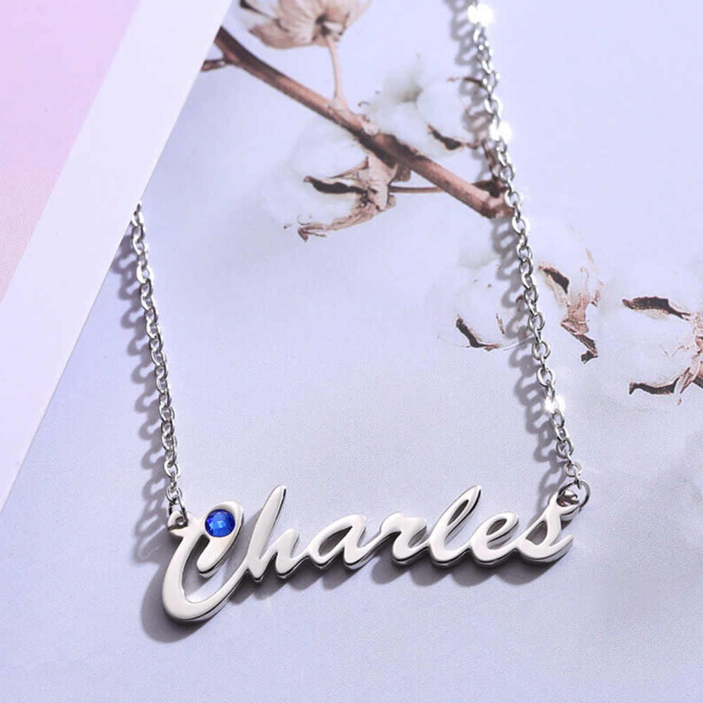 Silberne personalisierte Namenskette personalisierte "Carrie" Stil Namensgravurhalskette mit Geburtsstein